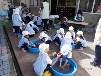 こちらは前日(29日)の焼き芋準備の様子。年長さんがお芋を洗って、キッチンペーパーとアルミホイルで上手に包んでくれました。