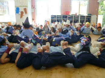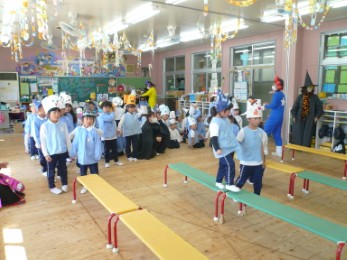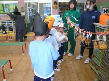 ゲームで二人組を作り(年長さんは年中さんか年少さんとペアになります)、そのペアから始まるハロウィン列車。