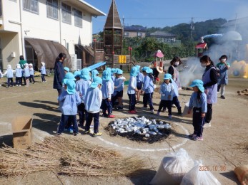 当日の朝、子ども達は、少し温かくなった籾殻の上にアルミホイルで包まれたお芋を置いて、ハロウィンパーティーへと向かいます。火の番をしてくださる先生方、よろしくお願いします。