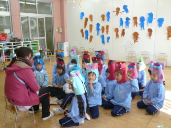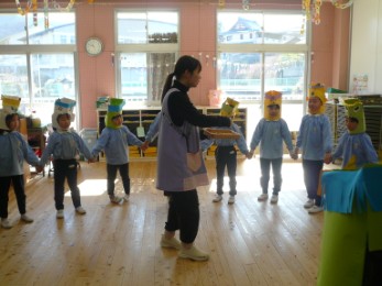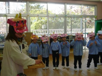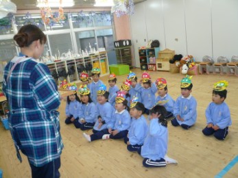 まずは担任の先生から、節分についてのお話を聞きますよ。