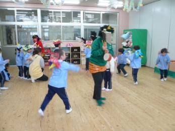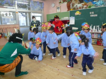 先生がまいた豆を拾ってみんなで豆まきをしよう!